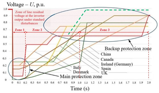 - Zone 2 (0.2–1.0 s) is characterized by the fact that most wind turbine manufacturers ensure that the required Ures value is maintained at the output of wind turbine inverters under standard disturbances. Therefore, with single-phase short circuits (more than 70% of the total number) eliminated by backup protections (the second stage region) with a time delay of up to 1 s, there will be no wind turbine shutdowns. However, the requirements of the grid codes of Denmark, Italy, Spain, and UK do not allow preventing disconnections of wind turbines.