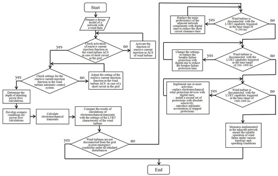 This article is structured as follows. Section 2 provides an overview of the stages of tightening the mandatory requirements for generation units of various types to prevent their unnecessary shutdowns during short-term voltage dips. Section 3 describes a calculation model of a real-world power system to which the wind farm is connected. This section also presents a list of typical disturbances in 110–220 kV distribution networks, which must be considered in transient calculations. Section 4 discusses the results of the transient calculation for 110–220 kV distribution networks to which the wind farm is connected. This section also delivers the results of the analysis of three operating zones characterized by different times of short-circuit elimination by relay protection. In addition, the paper presents the developed block diagram of the algorithm for checking the wind turbine LVRT settings. Consideration is also given to group and individual methods for ensuring the stable operation of wind turbines under typical disturbances in the distribution network, and to an assessment of their technical efficiency.