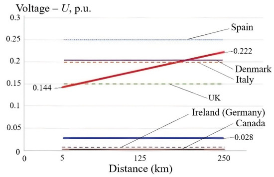 Figure 8 shows the requirements of the grid codes of various countries for the value of Ures, at which the wind turbine should not be disconnected. The calculated values of Ures at the outputs of the wind turbine inverters when the reactive current injection function is activated at the wind turbine during a short circuit in the distribution network are shown by a red solid line, and when deactivated, by a blue one (Figure 8).