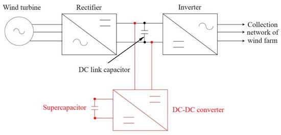 Simplified scheme for connecting a supercapacitor with a DC-DC converter to the DC link of a wind turbine inverter.