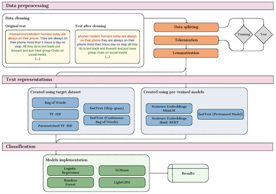 Our research methodology involved exploring multiple text representation techniques, focusing on their effectiveness in classifying AI-generated essays versus those written by students. The innovation of our approach lies in the comparative analysis of different methods, ranging from basic techniques like Bag of Words (BoW) to sophisticated methods such as embeddings created using fastText, MiniLM, and distilBERT, including those using pre-trained models and those trained from scratch. Figure 1 shows a diagram that illustrates the three main stages of the proposed approach.