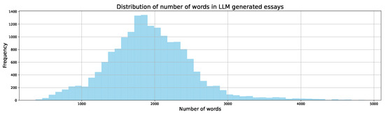 After filtering and cleaning, the dataset contained only valid essays. Figure 2 presents the distribution of the number of words in AI-generated essays. It can be observed that the word count distribution is similar to a normal distribution. This indicates that while most AI-generated essays center around a particular word count, there is still considerable variation, with some essays having slightly fewer or more words. Also, shorter essays are much more common than in student-written content.