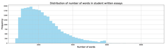 Distribution of number of words in student-written essays.