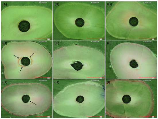 Images obtained by digital microscopy at 50× magnification for analysis of the mode of failure after push-out test. (A–C) Adhesive mode of failure; no sealer presents on the canal wall. (D–F) Cohesive mode of failure; sealer is located circumferentially on the canal wall. (G–I) Mixed mode of failure; sealer is present partially on the canal wall.