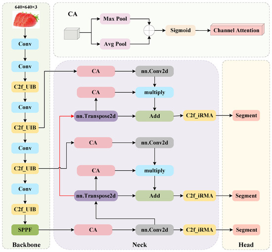 Strawberries originate from Europe and are beloved for their vibrant red color, rich fruity aroma, and sweet taste. According to statistics from the FAO [1], in 2022, the global area planted with strawberries was 397,603 hectares, with a production of 9,569,865 tons. Strawberries are among the most extensively grown fruit species worldwide. However, the growth of strawberries can be significantly threatened by biotic or abiotic factors, which pose a great risk to both the productivity and quality of strawberries. One of the most significant threats is the presence of various diseases affecting strawberries, such as gray mold, anthracnose fruit rot, leaf spot disease, etc. Therefore, effective identification and diagnosis of strawberry diseases are crucial aspects of disease prevention and control in strawberries. Traditional manual disease detection methods rely on professional technicians. However, with the rapid expansion of strawberry cultivation areas, the efficiency and real-time nature of this approach are gradually becoming insufficient to meet demands. In recent years, with advancements in artificial intelligence technology, especially the significant breakthroughs in convolutional neural networks [2,3], instance segmentation technology, as an important innovation that combines the functionalities of object detection and semantic segmentation, is gradually making a significant impact in the field of computer vision. This technology not only accurately identifies and locates multiple similar objects within an image but also performs detailed analysis and labeling at the pixel level. Instance segmentation technology has achieved significant advancements in various fields, such as medical image analysis [4], industrial automation [5], autonomous driving [6], and agricultural disease control [7,8,9,10]. Compared to traditional neural networks, instance segmentation technology notably enhances the accuracy and efficiency of systems, providing robust support for precise identification and automated processing in complex scenarios.