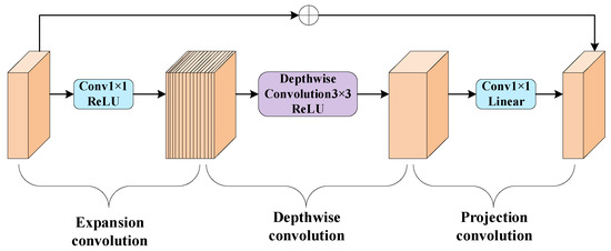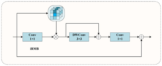The main idea of Inverted Residual Mobile Block (iRMB) is to enhance network performance on mobile devices by combining residual connections with mobile blocks. As presented in Figure 9, the iRMB module is made up of a depthwise separable convolution module and an interactive attention module. The first step involves feature expansion through 1 × 1 convolution to enhance the model’s expressive capability. The second step utilizes Depthwise Separable Convolution (DW-Conv), applying 3 × 3 convolution kernels separately on each channel to obtain multiple feature maps. Subsequently, the feature maps derived from depthwise convolution are combined using 1 × 1 convolution kernels to produce the final feature map. This significantly reduces computation and the parameter count while maintaining model effectiveness. Residual connections allow input features to be directly added to output features, aiding the network in learning identity mappings or residual information more easily. This structure enhances the model’s convergence speed and overall performance. Residual connections allow the network to more easily learn identity mappings or residual information by directly adding input features to output features. Ultimately, it achieved the goal of improving the model’s convergence speed and performance.