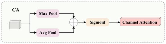 The High-level Screening-feature Fusion Pyramid Network (HS-FPN) first performs feature selection. As illustrated in Figure 7, the Channel Attention (CA) module processes the input feature maps, combining the feature maps generated through global average pooling and global max pooling. Afterward, the weight values for each channel are computed using the sigmoid activation function to obtain the final weights. The CA module uses this approach to accurately extract key information about strawberry diseases from each channel, while avoiding further loss of information. Subsequently, filtered feature maps are obtained by multiplying weight information with the corresponding proportion of feature maps. Before feature fusion, each proportional feature map’s channel count is reduced to 256 using a 1 × 1 convolution, ensuring alignment across feature maps of different scales. CA is represented as follows: