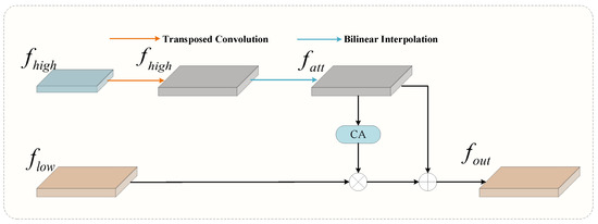 After feature extraction from the feature maps, higher-level features are used as weights to eliminate basic semantic information contained in lower-level features, promoting targeted feature fusion. As shown in Figure 8, given high-level features and low-level features , features are expanded using a transposed convolution with a stride of 2 and a 3 × 3 kernel, yielding . To ensure dimensional alignment between high-level and low-level features, bilinear interpolation is used to upsample or downsample the high-level features, resulting in . Finally, the low-level features filtered by the CA module are fused with the high-level features to obtain . The formulaic process of the SSF module is as follows: