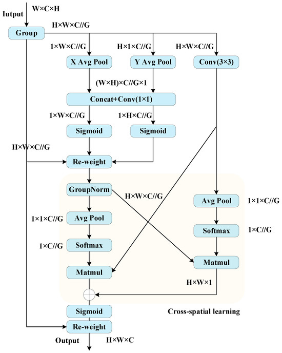 Efficient Multi-Scale Attention (EMA) demonstrates excellent performance across various visual tasks and is particularly adept at handling complex tasks involving multi-scale information. It effectively enhances the model’s perceptual skills across a range of scales while maintaining high efficiency. It avoids the impact of downscaling in the convolution process by transforming a segment of the channel dimension into the batch dimension and dividing the channel dimension into two types of sub-features: 1 × 1 and 3 × 3. As shown in Figure 10, an EMA unit has input and output . First, separate into G sub-features based on the channel dimension, i.e., , and then apply pooling operations with kernel sizes (1, W) and (H, 1) along the width and height dimensions, respectively. These operations generate two sets of one-dimensional features that encode vertical and horizontal contextual information. In the 3 × 3 branch, 3 × 3 convolutional kernels are used to capture multi-scale features. Concatenate two independent one-dimensional feature encodings and then decompose them into two vectors. Use the nonlinear sigmoid function to model the two-dimensional binary distribution of linear convolution. Then, implement different cross-spatial interaction features in the two branches. The outputs of the two branches are globally encoded using two-dimensional global average pooling operations to incorporate global information. The resulting outputs are then transformed into corresponding feature maps . In the end, each group’s output feature map is calculated by combining two spatial attention weight values that have been produced. This aggregated result is applied to the input feature map through multiplication, yielding the output , where and have the same dimensions. The two-dimensional global pooling operation is expressed as follows: