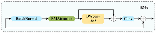 Attention mechanisms can flexibly capture various types of information from feature maps, inspired by the way human vision processes visual information. Various categories of strawberry disease in images exhibit distinct disease characteristics and diverse shapes. Therefore, introducing the attention mechanism helps to effectively integrate features across different scales. This paper designs the iRMA (Figure 11) mechanism by borrowing the inverted residual structure of iRMB and combining it with a plug-and-play EMA attention mechanism. The iRMA mechanism is incorporated into the C2f module, resulting in the C2f_iRMA structure (Figure 12). As shown in Figure 11, this module utilizes EMA for cross-space learning, aggregating information across different spatial dimensions. It captures spatial features through depthwise separable convolutions. Simultaneously, this component is connected by a residual edge to prevent gradient vanishing, thereby enhancing the stability and generalization effectiveness of model training. Finally, 1 × 1 convolutions are used to restore the channel number. Zhang et al. [40] improved YOLOv8’s performance by designing the iRMA module. However, their paper lacks details on the specific structures of iRMA and C2f_iRMA, resulting in design differences compared to this paper. While both studies employ C2f_iRMA for YOLOv8 enhancements, they differ in YOLOv8 locations. This paper’s iRMA structure integrates all C2f modules in the neck network, whereas Zhang et al. utilized two C2f_iRMA modules. These design variations and distinct application scenarios lead to differences in model performance and applicability. Lastly, Zhang et al. did not provide experimental data to validate the performance of their iRMA module against EMA and iRMB, whereas this paper’s experiments demonstrate that the iRMA module outperforms EMA and iRMB in strawberry segmentation tasks. The design of iRMA enhances segmentation performance while effectively controlling the increase in parameters, addressing the issues of the elevation of iRMB parameters and the limited improvement in EMA performance, and tackling the multi-scale challenges in strawberry disease recognition. This allows the research presented in this paper to achieve higher precision more easily during the development of lightweight models.