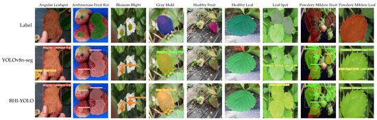 To better demonstrate the improvement in instance segmentation in this paper, in addition to the YOLOv8 baseline model, we selected current mainstream instance segmentation algorithm models for comparison, including YOLACT and the YOLO series, together with Mask R-CNN and Cascade-Mask R-CNN [47]. According to Table 7, the BHI-YOLO model from this experiment demonstrates an increase in mAP compared to the other seven instance segmentation models by 5%, 1.7%, 6.2%, 0.1%, 6.8%, 8.5%, and 10.4%, separately. The mAP achieves optimal results, with only YOLOv9 [48] demonstrating similar segmentation performance to the model improved in this paper. However, the parameters, GFLOPs, and model size of YOLOv9 are 4.23 times, 4.64 times, and 4.20 times those of YOLOv8, respectively, making it a very large model that is difficult to improve in terms of lightweight design. In contrast, YOLOv8 is inherently smaller and has become even more lightweight after optimization, making it extremely suitable for the research direction of this paper. Compared to other algorithms, BHI-YOLO in this paper exhibits outstanding performance in strawberry disease instance segmentation tasks, while minimizing parameter counts and computational overhead, making it easier to deploy on mobile devices.