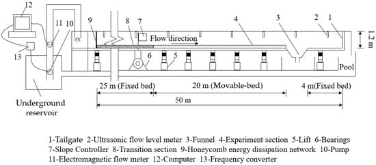The experiments were conducted at the Daxing experiment base of the China Institute of Water Resources and Hydropower Research. The experiment flume, as depicted in Figure 1, measures 50 m in length, 1 m in width, and 1.2 m in height, with an adjustable slope range of 0–0.01 and a 200 m3 underground reservoir. The flume is equipped with a sophisticated measurement and control system that adjusts the flow rate through a computer-controlled frequency converter with feedback closed-loop control and measures the flow rate using an electromagnetic flow meter before flow enters the flume. The flow level and depth along the flume are monitored by eight ultrasonic-level meters mounted above the flume and twelve steel straightedges affixed to the flume sides. The transparent glass sides of the flume enable clear observation of sediment particle movement on the bed surface and the dynamics of dune movement. The slope gradient refers to the glass flume inclination angle. The slope gradient was adjusted using lifts, which automatically set the flume to the desired inclination before the experiment.