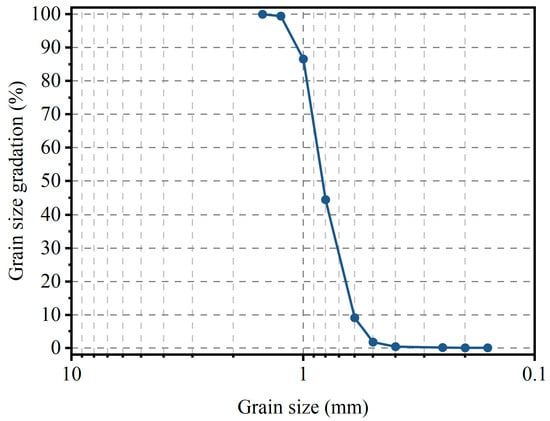 Approximately 25 m upstream of the flume, a transition section consisting of a 10 cm thick layer of 20 mm pebbles was installed, and the experiment section was situated about 20 m downstream of the flume. A funnel (length: 1 m; width: 1 m; depth: 0.8 m) was positioned between the end of the experiment section and the tailgate to collect sediment. The sediment captured in the funnel during the experiment was classified as bedload particles. The experiment sediment comprised uniformly sized crushed quartz sand particles with a median grain size of 0.83 mm, as depicted in the grading curve displayed in Figure 2.