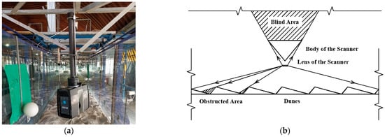 Illustration of scanning range of scanner and obstruction by bedforms. (a) Bedform measurement in flume, upside down scanner, and target spheres, and (b) illustration of scanning range of scanner and obstruction by dunes.