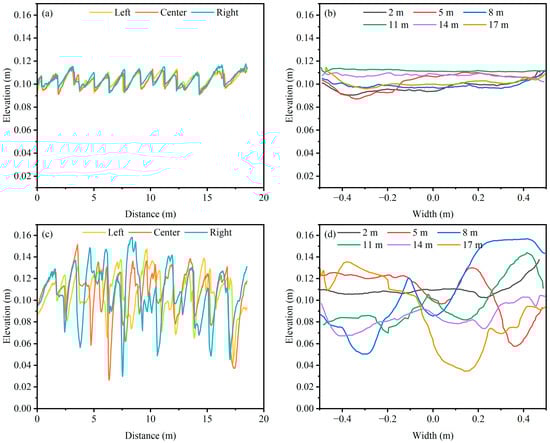 The bedforms generated in this experiment exhibit both 2D and 3D topographies. In this study, three longitudinal profiles were extracted: one from the center of the flume width and two others at intervals of 20 cm to the left and right. Additionally, cross-sectional profiles were extracted every 3 m along the length of the flume, starting from the 2 m position, as shown in Figure 4. From the longitudinal profile perspective, the arrangement of crests and troughs on the 2D bedform is noticeably more regular than that on the 3D bedform (Figure 4a,c). From the cross-sectional profile perspective, the elevation variation across the flume width is significantly smaller for the 2D bedform compared to that for the 3D bedform (Figure 4b,d).