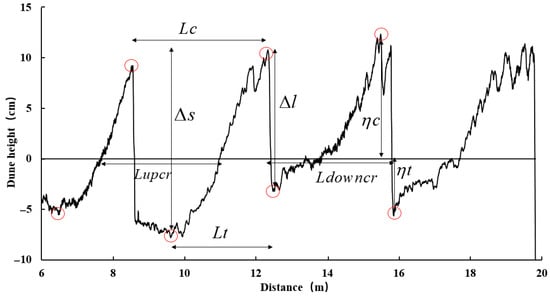 This research defines four types of dune lengths: Lc, the horizontal distance between the adjacent crests; Lt, the horizontal distance between the adjacent troughs; Lupcr, the horizontal distance between two adjacent nodes with positive slopes on the zero axis at equilibrium; and Ldowncr, the horizontal distance between two adjacent nodes with negative slopes on the zero axis at equilibrium. The average lengths for each type are denoted as Lc-ave, Lt-ave, Lupcr-ave, and Ldowncr-ave, respectively. The “average” value for each bedform parameter was calculated as the arithmetic mean of the corresponding values obtained from the identified bedforms.