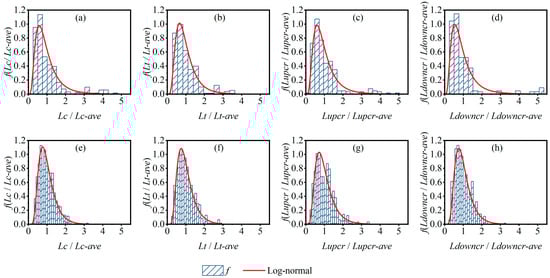 The probability density distribution of dune length, as fitted by the program, is depicted in Figure 6. Panels (a) through (d) of Figure 6 illustrate the distribution of the dune lengths (Lc, Lt, Lupcr, and Ldowncr) for the 2D bedforms, while panels (e) through (h) display the distribution for the 3D bedforms. The results indicate that the four dune lengths (Lc, Lt, Lupcr, and Ldowncr) for both the 2D and 3D bedforms adhere to a lognormal distribution. The parameters of the lognormal distribution for the dune length of the 2D and 3D bedforms are listed in Table 2. According to Table 2, the mean log standard deviations for the dune length of the 2D and 3D bedforms are 0.58 and 0.45, respectively. The mean log standard deviation for the 2D bedforms is marginally higher than that for the 3D bedforms by 0.13, which reflects a disparity in the distribution of dune lengths, as depicted in Figure 6a–d.