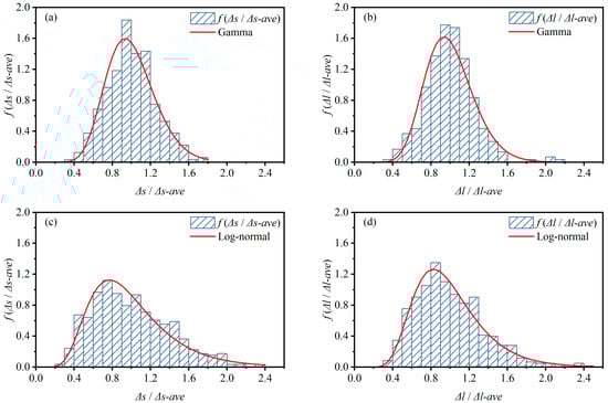 The probability density distribution of dune height, as fitted by the program, is shown in Figure 7. Panels (a) and (b) of Figure 7 depict the distributions of dune heights (Δs and Δl) for the 2D bedforms, and panels (c) and (d) illustrate the distributions for the 3D bedforms. The results reveal that the dune heights (Δs and Δl) for the 2D bedforms follow a Gamma distribution, whereas those for the 3D bedforms follow a lognormal distribution. The distribution parameters for the dimensionless dune heights of the 2D and 3D bedforms are detailed in Table 3. For the 2D bedforms, the Gamma distributions of Δs and Δl exhibit shape parameters of 15.185 and 15.610, respectively, and scale parameters of 0.066 and 0.064, respectively. The shape and scale parameters for Δs are similar to those for Δl. The mean and standard deviations corresponding to the lognormal distributions of Δs for the 3D bedforms exhibit characteristics similar to those of Δl.