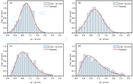 The probability density distributions of the crest height and the trough depth fitted by the program are shown in Figure 8. Figure 8a,b represents the distributions of the crest height ηc and the trough depth ηt of the 2D bedforms, and Figure 8c,d represents the distributions of the crest height ηc and the trough depth ηt of the 3D bedforms. The results demonstrate that the ηc and ηt of the 2D bedforms obey the normal distribution, and the ηc and ηt for the 3D bedforms obey the Gamma distribution. Table 4 outlines the distribution parameters for the dimensionless crest height and trough depth of both the 2D and 3D bedforms. The standard deviation for the crest height of the 2D bedforms, which follows a normal distribution, is 0.334. This value is slightly smaller than that for the trough depth, resulting in a steeper probability density distribution curve for the crest height compared to that of the trough depth. Conversely, the scale parameter for the trough depth of the 3D bedforms following a Gamma distribution is 0.324, which is slightly larger than that for the crest height. This attribute produced a more dispersed probability density distribution curve for the trough depth compared to that of the crest height.