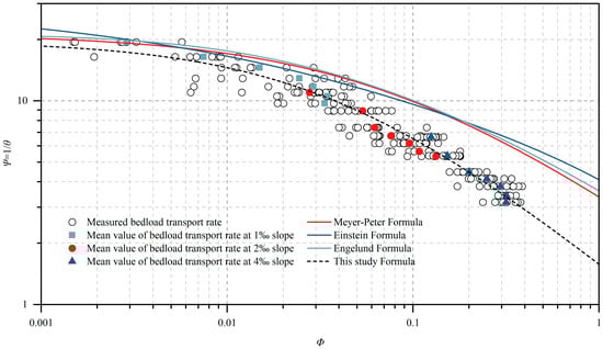 Based on the bedload transport rate measured during the experiment and the flow conditions (Table 1), the bedload transport intensity and the flow intensity at the different slopes were computed. These calculations were performed using the representative bedload transport formulas derived from the experimental results, as illustrated in Figure 9.