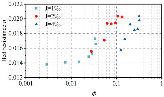 To further examine the patterns of change in bed resistance, the correlation between measured bed resistance and bedload transport intensity was analyzed and is illustrated in Figure 11. This figure reveals a significant positive correlation between bed resistance and bedload transport intensity. Within the same slope, the data from the different experiment groups are distributed across distinct regions; however, they exhibit a consistent overall trend of increasing bed resistance with heightened bedload transport intensity.