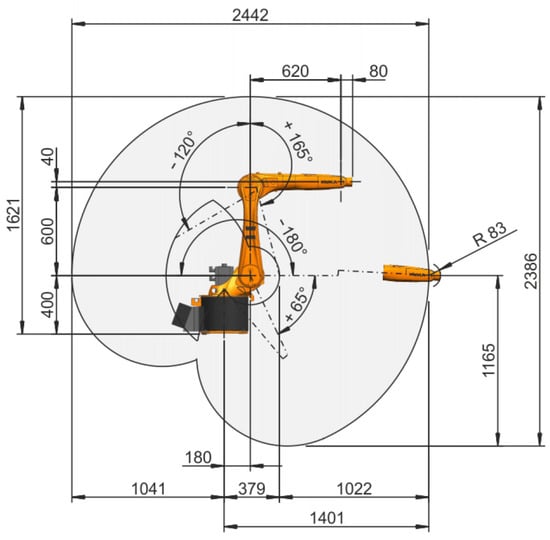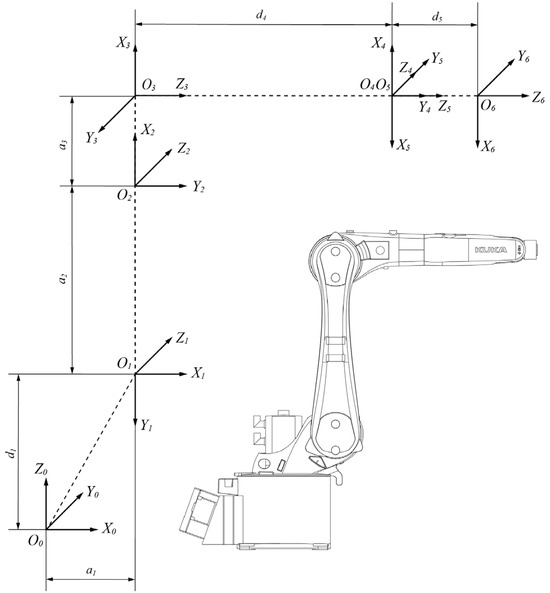 This paper focuses on the KR5 R1400 robot, manufactured by KUKA. The robot is a six degree-of-freedom (DOF) serial manipulator, with its geometric parameters displayed in Figure 1. The D–H parameters are shown in Figure 2.