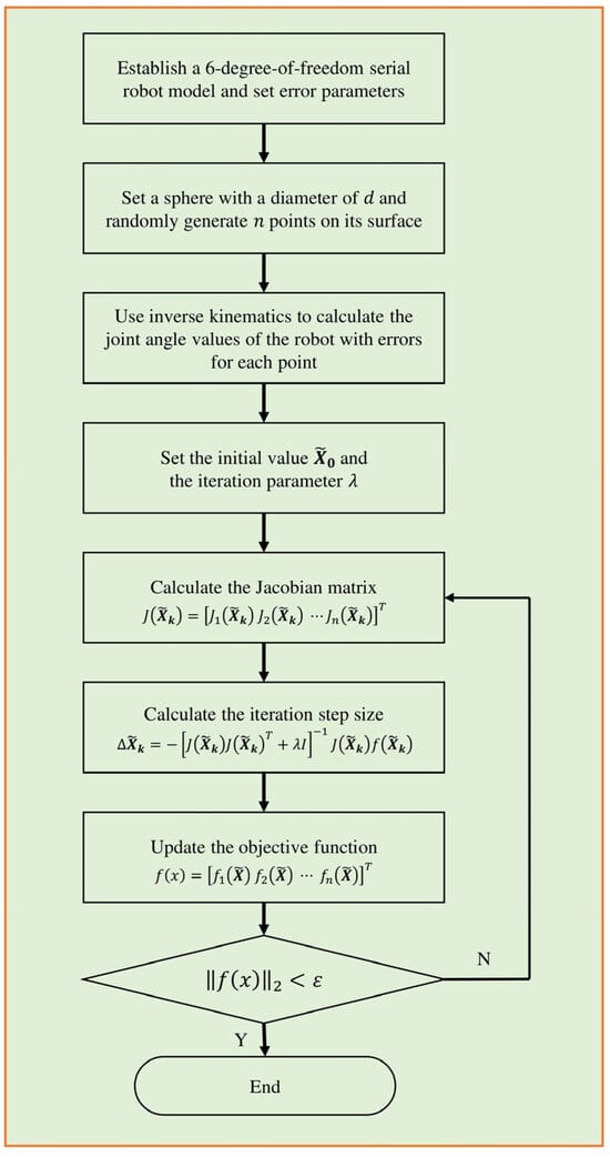 is a positive adjustable coefficient. In nonlinear least squares problems, the choice of the initial values is crucial. If the initial values are not chosen appropriately, it may lead to slow convergence or cause the algorithm to become trapped in a local optimum. In this calibration problem, since the robot’s geometric errors are small, the initial values can be set to zero. The initial values for the end-effector deformation error parameters can be derived based on their physical meaning. The coordinates of the calibration sphere’s center, , can be determined by fitting the actual positions measured by the end-effector using the least squares method [18]. Once the initial values are established, the step size is calculated using Equation (38) and the parameters are iteratively updated, gradually minimizing the objective function. The iteration stops when the step size becomes smaller than a specified threshold, at which point the parameter values represent the optimal solution to the nonlinear least squares problem.