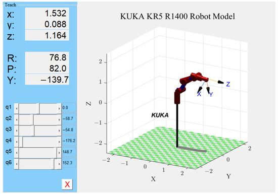 Based on the D–H convention and the geometric parameters of the KUKA KR5 R1400 robot, the D–H parameter table was constructed, as shown in Table 1.