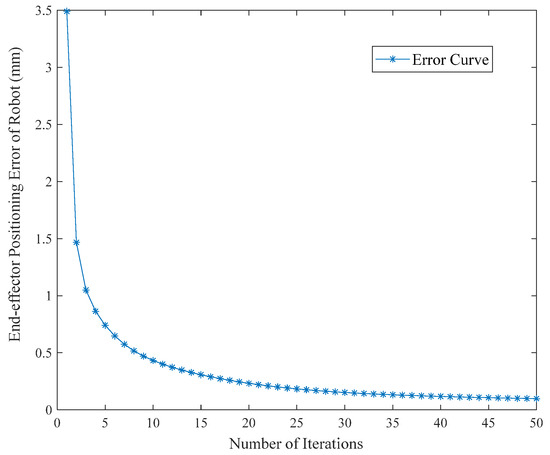 According to the simulation experiment procedure, the first step was to preset the robot’s geometric error parameters and the end-effector deformation error parameter. These errors were introduced to simulate real-world conditions. The preset geometric error parameters are listed in Table 2, and the deformation error parameter of the robot’s end-effector was set to 0.002.