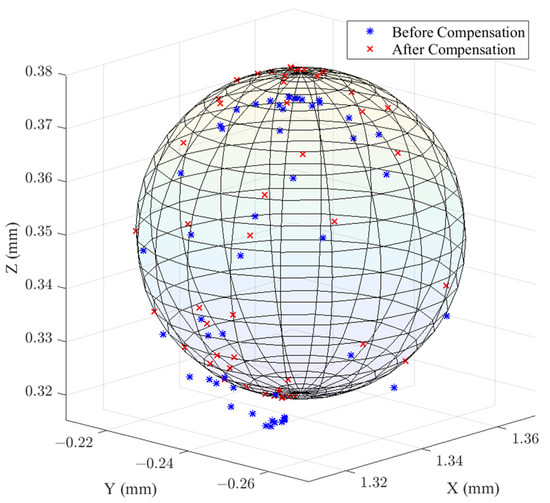 To validate the effectiveness of the simulation results, the compensated errors were applied to the robot, and the position of the end-effector was compared to its position without compensation, as shown in Figure 7. In the figure, the sphere represents the actual surface of the calibration sphere. The blue points indicate the position of the robot’s end-effector without error compensation, showing a significant deviation from the surface of the calibration sphere. In contrast, the red points represent the position of the end-effector after error compensation, closely aligning with the surface of the calibration sphere, effectively restoring the original contact positions.