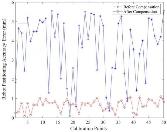 As shown in Equation (39), the positioning accuracy of the robot was evaluated by calculating the absolute difference between the distance from the robot’s end-effector to the center of the calibration sphere and the sphere’s radius.