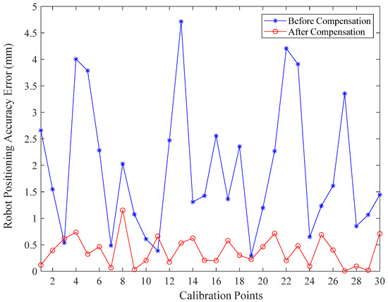 Comparison of end-effector positioning accuracy of the robot before and after experimental calibration error compensation.