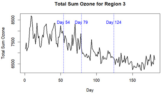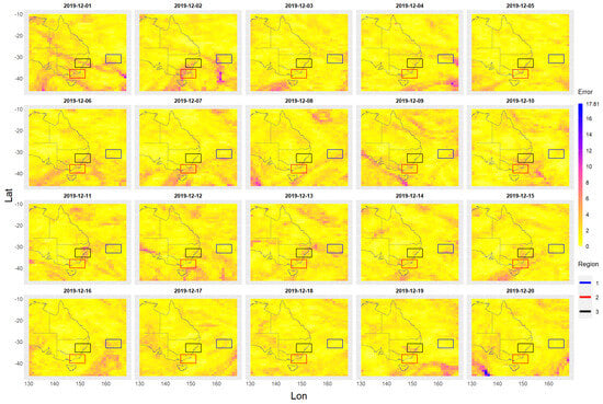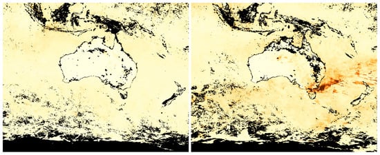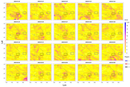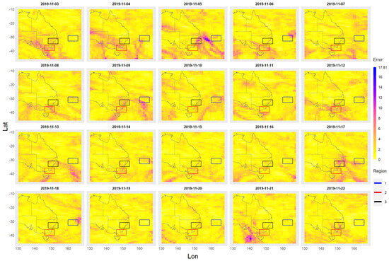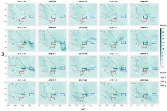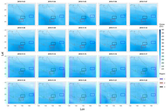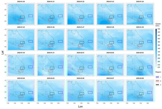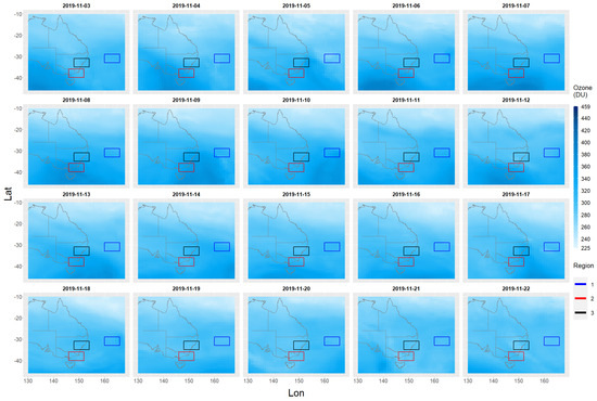 Figure 5. This area will be referred to here as the study area. All the ozone/aerosol data are from the 2019–2020 Australian bushfire period covering the dates from 1 September 2019 to 29 February 2020 and will be called the study time period. There is a total of 182 days between these two dates. On the 68th day (7 November 2019), the first sign of bushfire aerosol emissions appears and the last relatively small emission of bushfire aerosols occurs on the 159th day (6 February 2020). Total sum ozone (TSO) and total sum aerosol (TSA) values are also computed. These total sum values are equal to the sum of all cell values contained within the rectangular region.