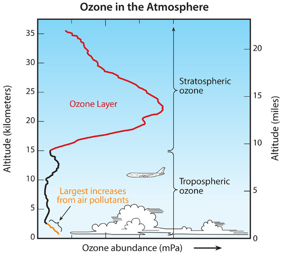 https://csl.noaa.gov/assessments/ozone/2018/twentyquestions/, accessed on 30 June 2023, provides a schematic of ozone levels at different heights in the atmosphere. This particular ozone level diagram indicates how ozone varies with height in the tropics. Notice that predominantly ozone is concentrated in the stratosphere, with its distribution peaking at around 23 km.