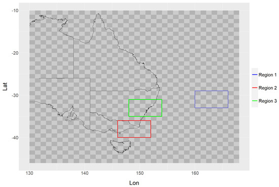 We have defined three regions, located on or off the east coast of Australia, and they will be referred to as Region 1, Region 2 and Region 3. The longitude (lon) and latitude (lat) coordinates of their respective left/right and top/bottom edges, and a description of their location on the map of these rectangular regions are as follows: