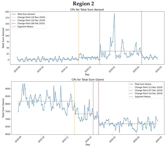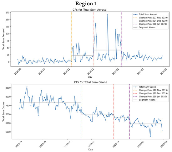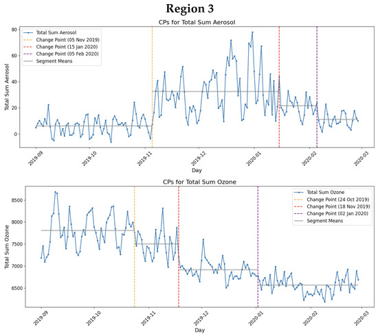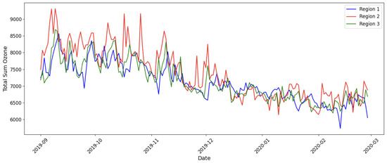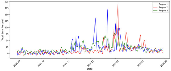 Figure 9 display the time series profiles for Total Sum Ozone and Total Sum Aerosol, respectively, over time and all 3 regions.