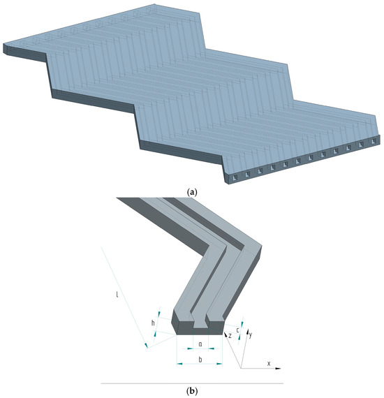 In this work, four types of microchannels were used: a straight channel and three with the angles between each section modified separately. The straight channel was introduced as the element by which the appropriate ranges of flows analyzed in zigzag channels were selected. We established the flow rate for the straight microchannel with a specific objective: to illustrate a scenario where heat removal from the solid surface is not optimized. This baseline scenario was intentionally chosen to highlight a condition that is less than ideal, with discernible room for improvement in heat transfer performance. By doing so, we created a reference point against which the enhancements in heat transfer efficiency, achieved through the introduction of zigzag modifications to the channel geometry, could be quantitatively assessed. Figure 1a presents a dimetric view of the multi-channel shape. Figure 1b presents the details of the single channel with the corresponding sizes used in formulations. The dimensions used in the calculations are given in Table 1.