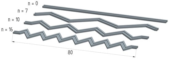 The geometry of all cases presented was developed using the construction of a solid along a given forming path shaped in the form of an appropriate zigzag. A zigzag profile was inserted into a rectangular area measuring 80 × 9 mm, making the number of sections change from a straight channel with 0 sections to 7, then to 10, and finally to 16 sections. The cooling channel was shaped from a rectangular profile with dimensions of 1 × 0.5 mm.