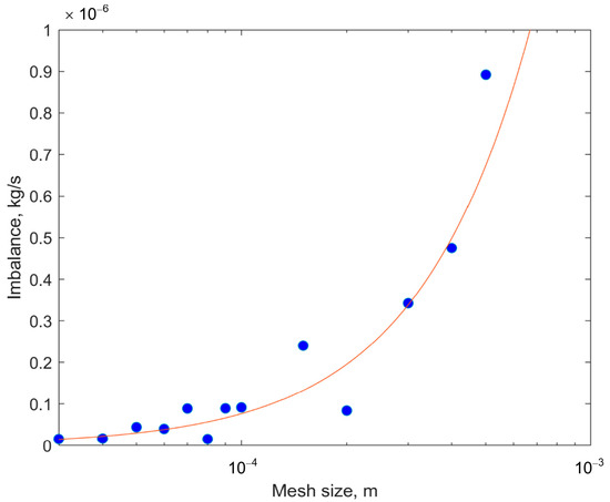 The size of the tetrahedral mesh cells was determined by the classical procedure based on a series of calculations with changing the base size of the cell. As soon as the mesh size decreased, no significant changes were observed in the obtained mass imbalance, taken as the difference between input and output; the base size of the mesh cells was considered sufficiently small to realistically express the running process. The figure below (Figure 3) presents the convergent profile of results against mesh size. As a size that guarantees the correct accuracy of the calculations with a reasonable calculation rate, 10−4 m was selected.