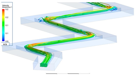 Figure 4 presents streamlines for the most complex shape calculated, the channel with segment number n = 16. At the location where the streamline encounters a change in direction, such as a bend or, in this case, a corner, the fluid may experience local reversed flow due to the differences in fluid velocity and pressure between the inner and outer walls of the bend. This can cause the fluid to separate from the wall and form eddies, which can be seen in the calculated streamline as regions where the flow direction changes abruptly or where the streamline curves back on itself. The size and shape of the eddies depend on factors such as the curvature of the bend, the speed of the fluid, and the viscosity of the fluid.