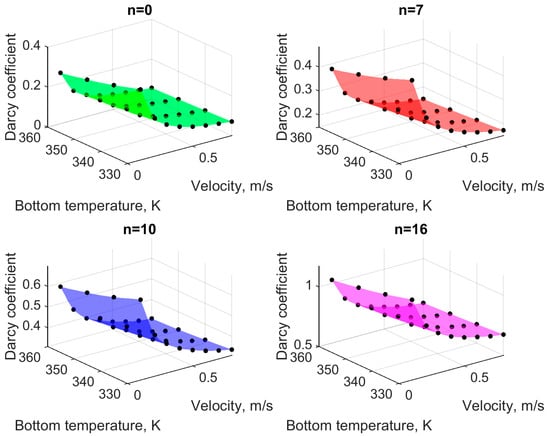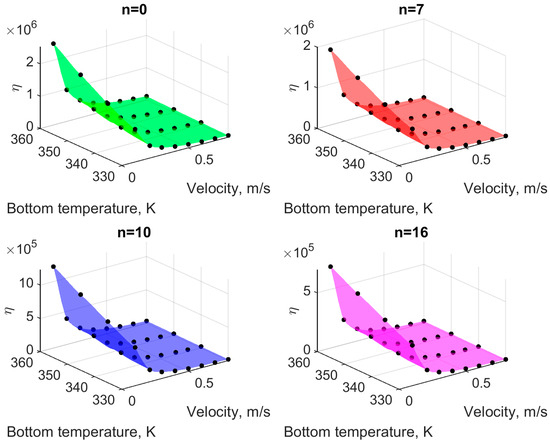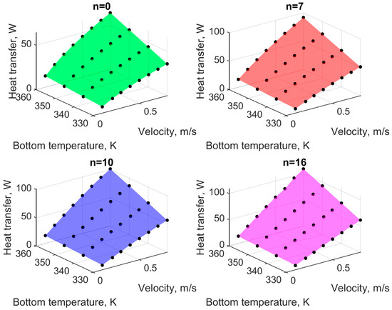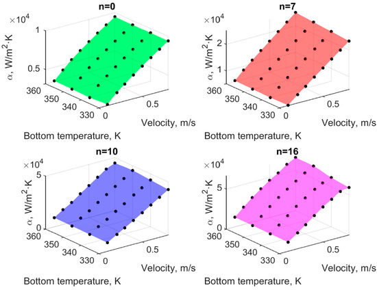 Figure 11 shows the averaged heat transfer coefficient, α, (Equation (27)) for all considered cases. As you can see, this coefficient practically does not depend on the bottom temperature, . However, an increase in flow velocity results in an almost linear increase in the coefficient for all microchannels. The greater the number of microchannel segments, the greater the increase in the heat transfer coefficient.