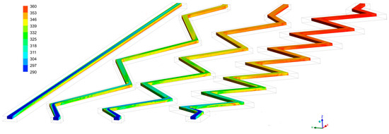 Figure 8 shows the water temperature distributions in the microchannels for the bottom temperature 360 K and the inlet velocity m/s. The temperature increases along the flow. It is clearly visible that increasing the number of zigzag pattern segments improves the heat exchange between the solid and the water flowing inside the microchannel. Each bend of the microchannel causes the flowing water to mix (Figure 4), resulting in improved heat transfer.