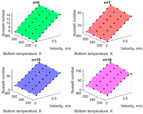 Heat transfer from a solid to a fluid can also be described by the dimensionless Nusselt number (Equation (28)). The Nusselt number shown in Figure 12 has exactly the same properties as the heat transfer coefficient, i.e., it does not depend on the temperature, but it varies with the flow velocity and the number of zigzag segments. The obtained values of Nusselt number are several times higher compared to those obtained experimentally by Gaikwad and Nalawade [Gaikwad]. This is due to the greater amplitude of the grooves compared to [Gaikwad] as well as the greater number of zigzags. These geometric differences result in increased flow disturbance and consequently, improved heat transfer. It should be noted that the flow velocity has a large influence on heat transfer. The Nusselt number changes several times with the increase in flow velocity. This type of effect was observed, among others, by Sui et al. [26].