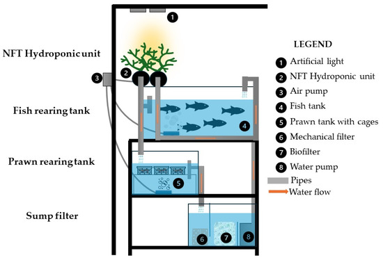 The water flow was designed to follow a gravity trajectory [1] from the NFT hydroponic culture (at the highest point of the system) to the shrimp rearing tank (at the middle point of the system) and into the biofilter of the well. The sump-type filter consists of three distinct sections: the mechanical, biological, and pump compartment. The mechanical filter contained a porous sponge. The mechanical filter was used for the purpose of capturing uneaten food and fish feces. The filter media of the biological filter had a surface area of 360 cm2 and consisted of 3 L biological balls (Aquamedit, Ø 19 mm, with specific surface area (SSA) cm2/cm3 and density 0.92 g/cm3) and 3 L ceramic ring media (Sera-Siporax, Ø 15 mm, with SSA 1000 cm2/cm3 and porosity < 1%). Water was pumped through the filter bed and fish tank at a ratio of 80% to 20%, respectively, using a pump (OCEAN RUNNER 1200) set at 2.02 cm3/min, resulting in a filtration rate of 2.24 cm3/min. The water renewal rate was less than 5%, which can be attributed to two primary factors: water evaporation and the purification processes inherent in the aquaculture system. The aquaculture system was configured to undergo eight circulation cycles per hour.