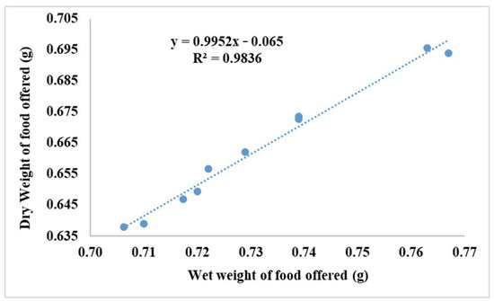 A linear regression (Figure 2) was employed to ascertain the correlation between the wet and dry weight of the feed provided: