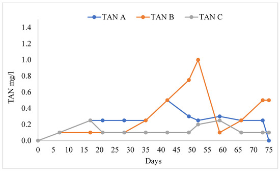 The water quality variables in the different treatments are shown in Table 1. The pH values ranged from 8.09 ± 0.07 to 8.21 ± 0.06. There were no significant differences in pH in all treatments (F = 0.614, F0.05 = 0.547). TAN (Figure 3) was significantly higher in treatment B than in treatments A and C (F = 3.87, F0.05 = 0.30). Nitrites (NO2−) were significantly higher in treatment B than in treatments A and C, and the mean value of nitrite was lower (Figure 4, F = 4.407, F0.05 = 0.019). Nitrate ions (NO3−) in the biofilter (Figure 5) were significantly higher in treatment A than in treatments B and C (F = 6.28, F0.05 = 0.005) with a range from 141.54 ± 4.78 mg/L to 108.46 ± 7.58 mg/L. Nitrate ions (NO3-in) in the fish tank were significantly higher in treatment A than in treatments B and C (F = 4.41, F0.05 = 0.019). In addition, nitrate ions (NO3-out) in the hydroponic unit were significantly higher in treatment A than in treatments B and C (F = 6.49, F = 0.004) and ranged from 111.92 ± 5.82 to 84.62 ± 4.02 (Table 1).
