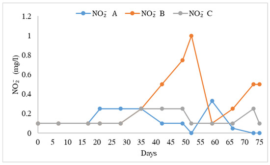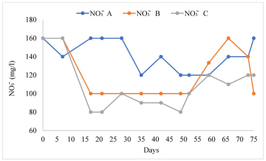 Ammonia serves as a suitable source of nutrients for plants, particularly when nitrate levels are low. However, plants absorb significantly more nitrate when ammonia levels increase [36]. Buzby and Lin [37] observed that in an aquaponic system with fresh water, where lettuce was cultivated, the retention efficiency of ammonia (NH4+/NH3) was superior to that of nitrate ions. In the present study, ammonia levels were maintained at a consistently low level throughout the experimental period, with the maximum value occurring in treatment B. This suggests that ammonia was oxidized to nitrite and nitrate ions more effectively in treatment C, which supports the uptake and growth of glasswort plants. Ref. [38] reported nitrate ion levels of 116.71 ± 17.57 mg/L and ammonia levels of 0.2 ± 0.02 mg/L, in a glasswort culture experiment conducted with marine aquaculture wastewater.