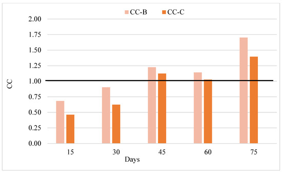 To express the compensatory growth in a numerical sense, the compensation coefficient (CC) was calculated (Figure 6). Treatments B and C showed no compensation tendency during the first 30 days of the trial (CC < 1). Both treatments showed compensation tendency from day 45 and until the end of the experiment (CC > 1). At the end of the trial, the CC values of groups Β and C were 1.70 and 1.39, respectively.