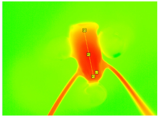 A temperature–time diagram was created using the IRBIS 3.1 plus software (InfraTec GmbH Infrarotsensorik und Messtechnik, Dresden, Germany), and the data was displayed in an Excel sheet (Microsoft Office Professional Plus 2016, Microsoft, Redmond, DC, USA). The data provided the initial temperature (T0), the maximum temperature (Tmax), the latency time until the maximum temperature is reached, and the delta between Tmax and T0. The data was not normally distributed. The values were analyzed statistically using the Kruskal–Wallis test. If there was a significant difference between the groups (p < 0.05), the Mann–Whitney pairwise test using the sequential Bonferroni procedure was performed. p-values < 0.05 was considered statistically significant. For the statistical analysis, three measuring points (P1, P2, and P3) were set individually in the tooth samples, located in the coronal, middle, and apical parts of each sample. To measure the mean temperature, the points were connected using a line (L1, Figure 2). To illustrate the results, box plot diagrams were created to demonstrate the median, first and third quartiles, and the minimum and maximum values. Outliers were defined as values exceeding 1.5 to three times the interquartile range. These are marked as dots, whereas distant outliers are marked as asterisks.