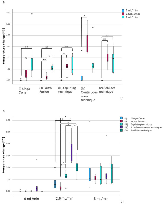 (a) Box plots for temperature changes at L1 at different fluid circulation rates relative to the obturation technique. (b) Box plots for temperature changes at L1, showing means for all the root sections in the thermography images. Temperature changes with the obturation techniques are compared relative to the fluid circulation rate. Asterisks between boxplots: * represents a p-value < 0.05, whereas ** represents a p-value < 0.01; ° represents outliers 1.5 to three times the interquartile range, asterisks above the boxplots represent distant outliers.